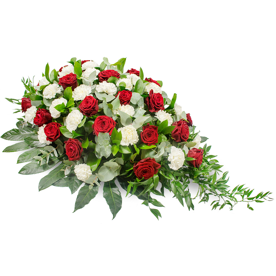 This exquisite bouquet is designed to honor cherished memories with its harmonious blend of deep red roses and pure white carnations. Adorned with premium greenery such as eucalyptus, Aral, and Ruscus leaves, each arrangement is thoughtfully crafted by our dedicated florists who select only the best, freshest blooms. The carefully displayed guard petals protect the delicate inner layers during transit, promising that your flowers arrive impeccable and vibrant.